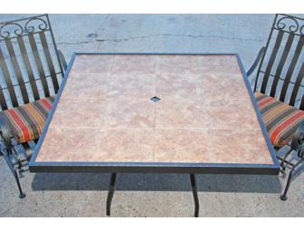 Outdoor living spaces are all the rage! Spring is just around the corner and you will be ready with this 48" square solid iron patio table with a tiled top and two spring action patio chairs with decorative backs and cushioned seats. Relax and enjoy the fresh air!