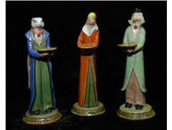 Three-piece figurine of wolf, rabbit and dog each holding a platter. A timeless and handsome gouping for any mantle or book shelf.