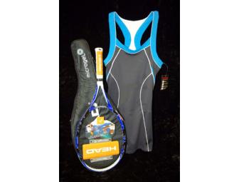 The Aussie Open, Wimbeldon, Roland Garros or the U.S. Open. Whichever is your favorite slam you can hit the courts in style wearing with this ladies (sm) Bolle' sleeveless tennis dress in charcoal and royal blue and white piping. Also included is a Head Team Series Microgel Raptor Racquet. Game, set, match!
