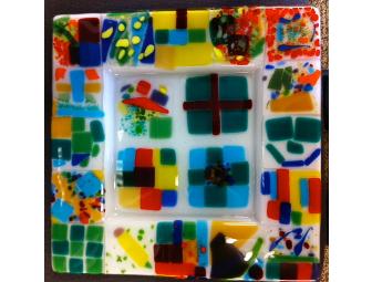 Each student in Ms. Widman's class created their own unique glass design using glass powder, shavings and pieces. Each square was then fused together and shaped into this stunning platter. What a great fixture on your table or a great way to serve your guests.