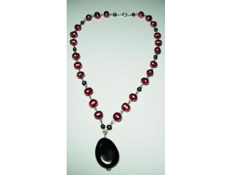 This black onyx pendant is hung from a sterling silver wire wrapped necklace combining dusty pink and grey freshwater pearls.