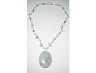 Sterlin silver wire wrapped amazonite necklace accented with fresh freshwater pearls and swarovski crystals.