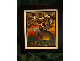 Mother and baby hippo with African birds. Framed oil on canvas mounted on wood. Artist: H. Samora