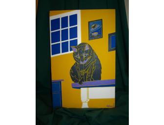 Oil on canvas. A blue cat sits on a kitchen table against a bright yellow background. A bold splash of color to brighten any room. Unframed. Artist: Angela Bond