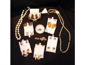 If you are a fan of retro, this beautiful assortment of vintage jewelry is for you. Many of the pieces are Cadoro and most are circa 1960. Cadoro costume jewelry was produced with the finest faux stones. Workmanship was always outstanding. The very reason that this vintage jewelry looks just as exquisite today as it did the day it was made. This grouping includes 9 pairs of clip earings, 2 necklaces, matching Cadoro earings and bracelet, and a red and white cubic zirconia pear shaped ring. As with all vintage items, these pieces reflect their loving use.