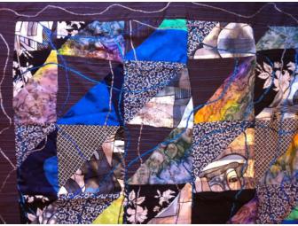This quilt is made of re-composed pieces of silk and cotton scarves and laced with delicate applique silky ribbons over the pattern.