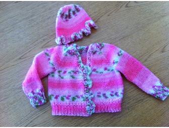 Darling pink sweater and matching hat handknit by Jane Braun.