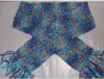 A bright, multicolored, hand-knit scarf featuring designer yarns of cotton, silk and bamboo. Can be used as a fashion accessory with dressy pants or a funky addition to the jeans in your wardrobe. Unique, lovely and the right size for everyone!