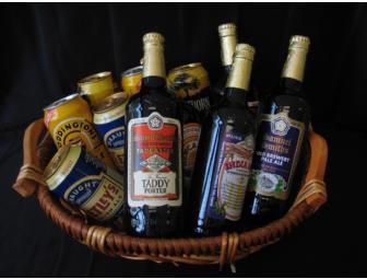 This basket contains a great assortment of British beverages - something for everyone: 2 cans Boddington Pub Ale, 2 cans Tetley's English Ale, 2 cans Blackthorn Fermented Cider, 1 bottle Sam Smith's India Pale Ale, 2 bottles Sam Smith's Taddy Porter (a very, very dark beer - guaranteed to put hairs on your chest), 1 bottle of Broon (Newcastle Brown Ale), 1 bottle Sam Smith's Old Brewery Pale Ale.