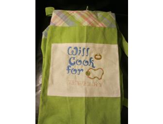 A cotton twill Apron embroidered with "Will Cook for Jewelry". Spring green apron with other spring colors.