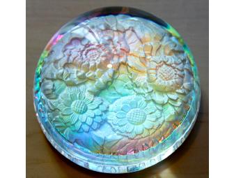 Enjoy the light shining through this unique piece of Robin Lehman glass art. Approximately two inches high, this unique piece will spark conversations and joy for years to come!