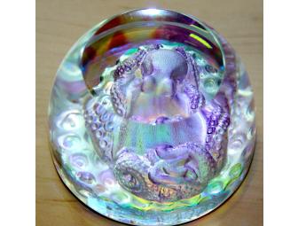 Enjoy the light shining through this unique piece of Robin Lehman glass art. Approximately two inches high, this unique piece will spark conversations and joy for years to come!
