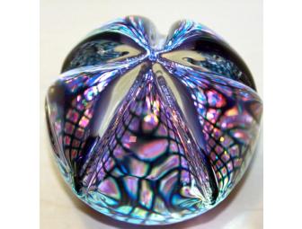 Enjoy the light shining through this unique piece of Robin Lehman glass art. Approximately two inches high, this unique piece will spark conversations and joy for years to come!