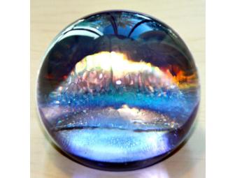 Enjoy the light shining through this unique piece of Robin Lehman glass art. Approximately two inches high, this unique piece will spark conversations and joy for years to come!
