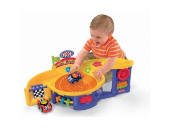 Ready, set, spin. Baby will love the put-and-take fun of placing two cool race cars on the ramp. They roll down and around on the swirling, light-up raceway, then, surprise. The spinning action sends each car out to the exit ramp and under the spinning flag. Or baby can pull the gearshift to start the fun. Zooming speedway sounds, lively music and five flashing lights ramp up the excitement, with a winner every time.