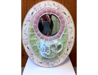 A one-of-a-kind mosaic wall hanging with a built-in teacup for flowers. Very cute!