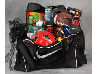 Size 4 Nike Soccer Ball, Nike Football, Wilson Basketball, Penn Tennis Balls, Nerf Gun, Rawlings Baseballs, Titleist Pro V Golf Balls, T90 Mini soccer ball, 24 oz. polar bottle, Game Stop $50 G.C., 7 single topping pizzas from Papa Johns