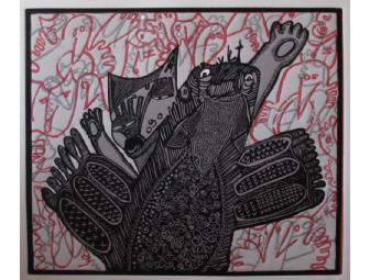 "Predator / Prey" dimensions are 16.5" W X 14" H. on paper 22" w X 21" H. It is made using oil based ink on Rives BFK. Original Linoleum Print.