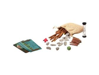 Stix and Stones - A prehistoric picture-making race. Use sticks and stones to convey specific words-caveman style. Perfect for mixed-age groups, children and adults, single or team play. No drawing skills required. Players roll to bid on how many pieces their team will use to make the assigned picture from the challenge card. The lowest bidder has to build the image with the fewest number of sticks and stones. The team who correctly guesses the picture before time runs out scores points to win. For 2 or more players or teams. Includes 75 challenge cards that feature 450 words from easy to difficult, 40 plastic sticks, 15 plastic stones, arrow, die, sand timer, and a burlap bag. Ages 7 and above.