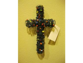 A decorative Wire Cross that is 13 inches high and 8 inches wide. With a little color, this cross will add a wonderful dimension to any room.