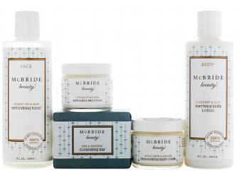 A selection of products from the McBride Beauty skincare line - Multi Purpose Stick, Instant Rescue Balm, Rosewater and Neem Anti-Aging Day Cream, Wheatgerm and Avocado Replenishing Night Cream, Cucumber and Aloe Soothing Body Lotion, and Soy and Coconut Cleansing Bar