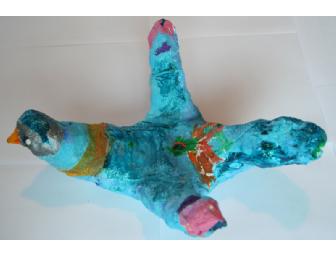 Handmade Paper Mache Bird made by Mrs. Scola's 5th Grade class. Each bird individually signed. Made with paper, acrylic paint, and glazed. About 1 foot long. Made by Kory Hurd.
