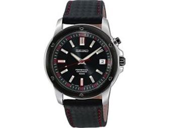 Seiko Men's watch features a brushed finish stainless steel case with screw down case back and black stainless steel fixed bezel. Water-Resistant: 100m, Case Diameter: 39.4, Color: Black with Red accents.