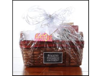Basket includes a men's fashion t-shirt, books, a water bottle, a canvas tote and other fun items from Folsom's Premium Outlet stores.