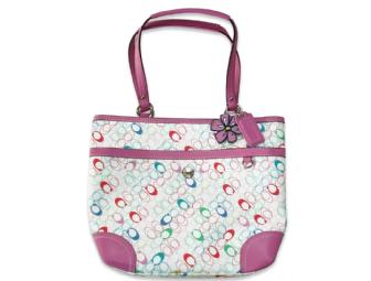 Coach Chelsea Pink Signature "C" Multicolored Tote with pink leather trim, silver/nickel hardware including Coach-embossed button on front, zip-top closure, front and back full-length slip pockets, double pink leather strap, pink leather hangtag, and flower hangtag, periwinkle blue lining.
