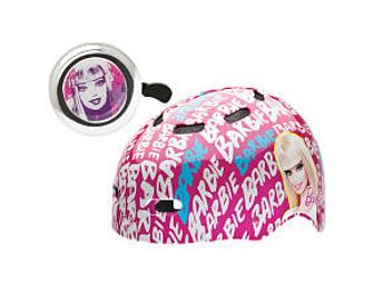 This bike helmet is for ages 5+ and fits head sizes 20-21 1/4 in. It comes with a bell and a pink soft Barbie basket for your daughter's bike. There's also a helmet and knee pads for Barbie!