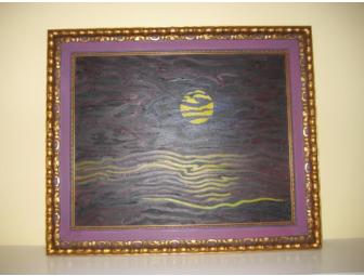 A gold moon sits in the dark night sky in hues of purple, blue and black. The frame is a brushed copper color with a band of matching purple shade setting off the colors of this original oil painting. Measures approximately 24 1/2"x 18".