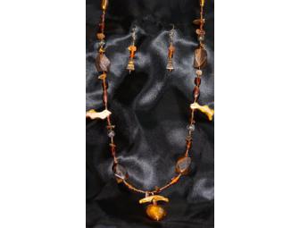 This unique set is sure to turn heads. Made with an assortment of beads made from tiger's eye, carnelian, shell, seed, and glass. The drop down heart on the necklace is made from Murano glass.