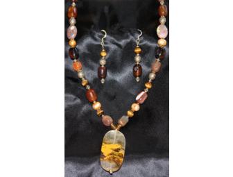 This is a beautiful earth tone set. Made with pewter, carnelian, tiger's eye, agate and fresh water pearls. The drop down stone measures 2" and the necklace has a T-clasp closer. A perfect addition to any collection.