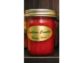 Two candles from Southern Candles; Spring, TX. 8 oz. jelly jar candles of Mulberry and Lavender fragrance. Each burns for approximately 50 hours.