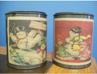 Small candles 4" high, in decorative cans, from Southern Candles (Spring, Texas). One candle is titled 'Dickens Christmas' and the other is 'Holiday Fantasy'.