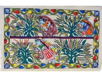 Featured on handmade Nepali lokta (daphne) paper this vivid painting is born from the traditional painting of lively designs by Maithili women on the walls of their homes in honor of festivals and wedding rituals. Created in conjunction with The Janakpur Women's Development Center, this painting and the others in this series, were used as a vehicle for the empowerment of Maithili women in Nepal by blending art and tradition. The JWDC is the first NGO in Nepal to use traditional painting as a means to empower women and provides training in literacy, management, leadership, gender awareness and basic business skills.