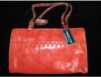 Add a dash of color to your wardrobe with the beautiful genuine leather handbag with embossed leaf design. This bag has multiple inside pockets and credit card holder as well as centered zippered section. Measures approximately 12.5" x 9" x 4".