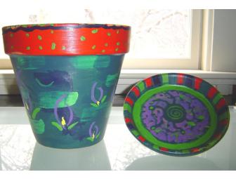 Handpainted Terra Cotta Flower Pot. Eight inches high,comes with handpainted saucer. Also included, a 30 minute garden design consultation with Karen McBain, gardener/owner of Garden Paths garden services.
