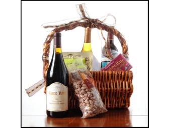 Enjoy a gift basket of goodies - or give it away! Wine includes: Castle Rock Pinot Noir, Chateau Michelle Chardonnay, and BV Cabernet Sauvignon. Snacks include: cinnamon almonds, mixed nuts, chocolate peanut brittle, dark chocolate with almonds and a $15 gift certificate to Trader Joe's.