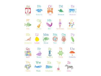 This framed 11x14 archival print was designed by Sigrid for her grandson's fourth birthday as an illustrated alphabet for his room. Both decorative and educational, it is a small, delightful art poster, which appeals to adults and kids alike. It is framed in a clean white wood frame.