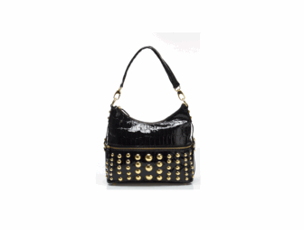 A sassy handbag with plenty of pizazz! Allover croc empossed patent leather, this bag will be your year 'round, go to accessory. Hardware is goldtone; zip pocket at front and back; one zippered compartment in interior as well.