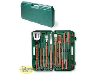 This set comes with 4 skewers, 8 corn cob handles, a steak fork, a basting brush, a long handled knife, jumbo tongs, a spatula, and a wire brush with scraper. All of these pieces come in a great carrying case.