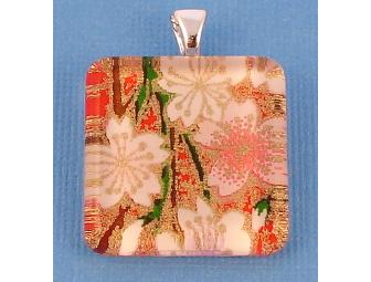 Hand-crafted pendant made with glass and Japanese paper. Lovely white and pink cherry blossoms against a bold red background with green and gold accents. Square pendant comes ready to wear with an adjustable silver plated snake chain.