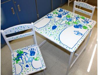 This set was painted with the hand and finger tips of our very own preschool students. The blues and greens in the design make this set pop! Perfect for coloring or playing games on it with a friend. A wonderful addition to any boys room.