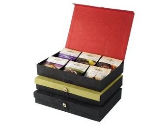 Handcrafted with tree-free Abaca plant fibers and cogon grass, Abaca tea boxes are an ideal, eco-friendly gift. This sustainable Abaca Tea Box is sealed with a whittled coconut-shell button and available in red or green. It includes Organic Darjeeling Estate, Orange Dulce, Green Tea Tropical, White Orchard, Chamomile Citrus and Rainforest Mate.