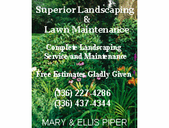Everyone at BCA knows the great commitment to excellence and the work ethic of our very own Ellis and Mary Piper. They keep BCA looking great and can do the same for you! Landscaping truly is superior with Mr. & Mrs. Piper. Their years of experience and attention to detail will do wonders for your landscaping or home lawn project.The highest bidder will win $350.00 worth of landscaping or lawn maintenance from Superior Landscaping and Lawn Maintenance. Spring is around the corner, win this item and your lawn will be looking its best!
