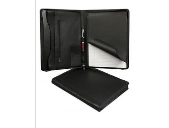 "Crafted from soft smooth full-grain napa leather in black, the Meridian letter pad features a note pocket, two card pockets, lined letter pad and a pen holder." External dimensions are 12.5" X9.75."