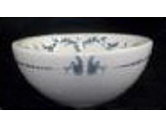 Round wall-mounted Powder Room sink in white porcelain with hand-painted blue garland getail with two swans around front of sink as well.