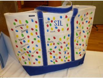 “Handy” Canvas Book Tote, decorated with the children’s uniquely precious prints. Filled with a treasury of books chosen by your kindergarten teachers for bedtime and beyond.
