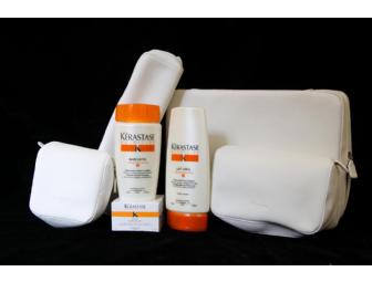 Kérastase products are continually nominated and awarded the most prestigious honors in the industry. This is your opportunity to try them for yourself. Four signature Kerastase travel totes hold Kerastase Bain Satin, Nacre Nutri-Sculpt, Lait Vital, comb.